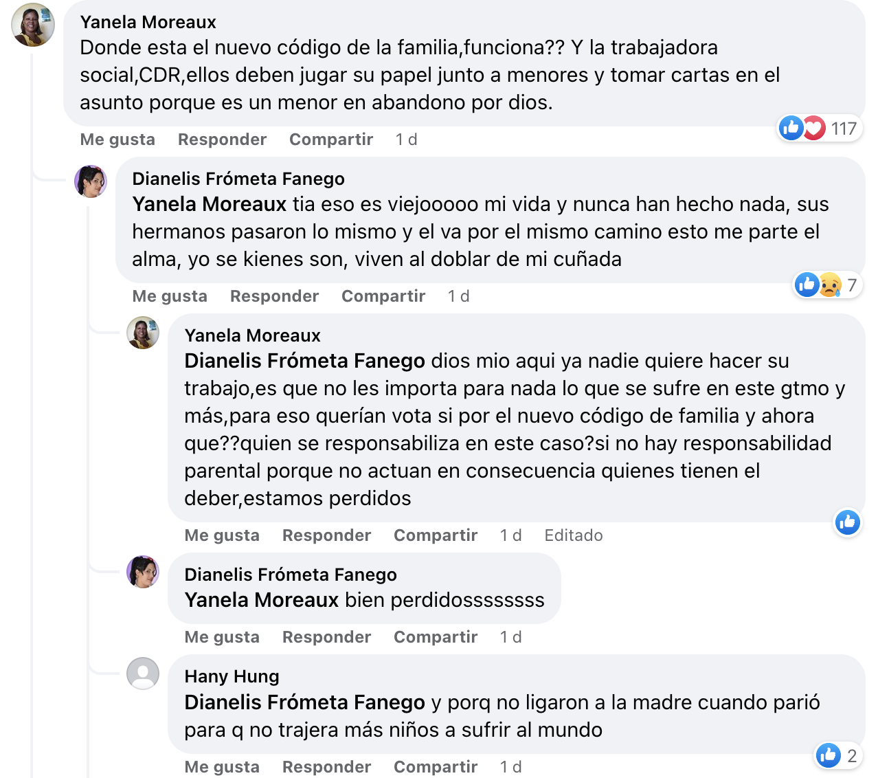 “Qué hacen las autoridades, y su “magnífico y gran Código de familia?… pues como siempre, haciendo leyes, inventando porquerías como siempre”; “Si el niño hubiese puesto un cartel, enseguida llegan todos los que tienen que ver con la protección al niño, código de m…”; “En Cuba ya no existe nada, donde está el código de la familia, donde está el delegado de esa zona que no hace más de 7 días fueron a votar por supuestamente una persona que va a representar la comunidad”.