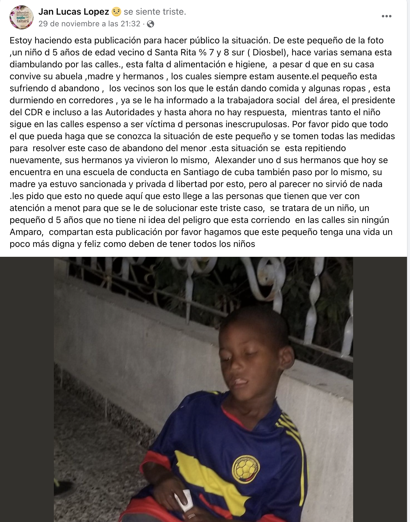 “Sus hermanos ya vivieron lo mismo, Alexander uno de sus hermanos que hoy se encuentra en una escuela de conducta en Santiago de Cuba también pasó por lo mismo, su madre ya estuvo sancionada y privada de libertad por esto, pero al parecer no sirvió de nada les pido que esto no quede aquí que esto llegue a las personas que tienen que ver con atención a menor para que se le dé solución a este triste caso, se tratara de un niño, un pequeño de 5 años”, escribió Jan Lucas que por lo que describe pareciera un vecino de la comunidad donde el pequeño se encuentra desamparado.