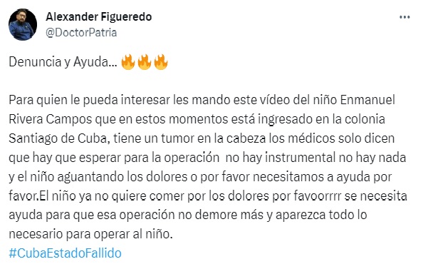 El médico y opositor al régimen cubano Alexander Figueredo fue quien dio a conocer esta angustiosa situación a través de su cuenta en X (Twitter). En un video compartido, se observa al niño llorando desesperadamente debido a los intensos dolores que padece.