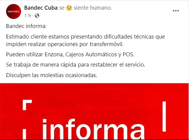 El Banco de Crédito y Comercio de Cuba (Bandec) informó en horas de la mañana del sábado 31 de agosto que hay interrupciones en Transfermóvil, la plataforma de pagos electrónicos del gobierno castrista. A través de una publicación en su cuenta oficial de Facebook, la entidad bancaria señaló que enfrenta dificultades técnicas que impiden la realización de operaciones a través de esta herramienta.