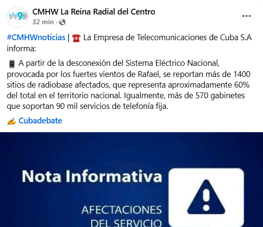 “A partir de la desconexión del Sistema Eléctrico Nacional, provocada por los fuertes vientos de Rafael, se reportan más de 1400 sitios de radiobase afectados, que representa aproximadamente 60% del total en el territorio nacional. Igualmente, más de 570 gabinetes que soportan 90 mil servicios de telefonía fija”, refiere el monopolio estatal.