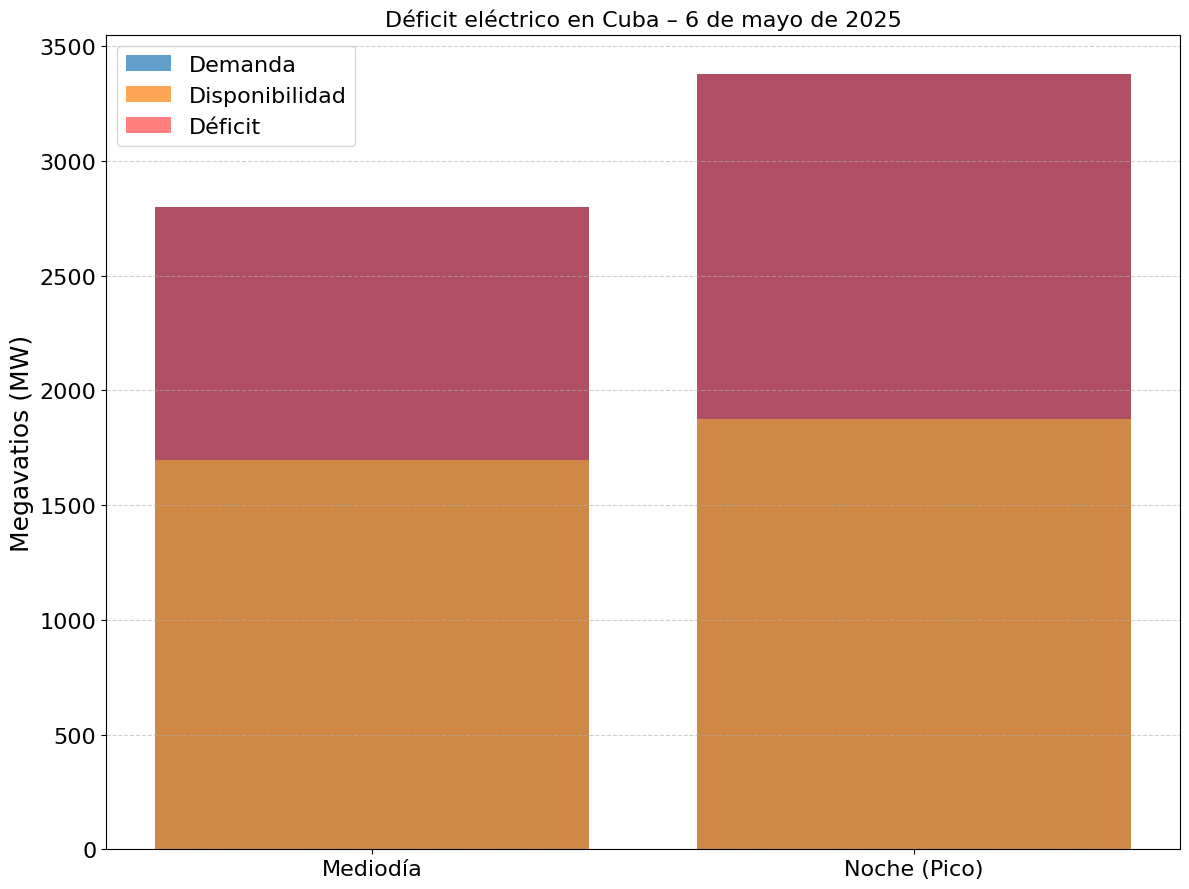 Durante el mediodía del martes 6 de mayo, el déficit estimado será de 1.380 MW, pero en el horario nocturno la situación empeorará. El pronóstico oficial de la Unión Eléctrica es de una demanda máxima de 3.380 MW frente a una disponibilidad de apenas 1875 MW, lo que significa un déficit de 1.575 MW. Desde el Despacho Nacional de Carga se prioriza a La Habana, por lo cual el resto de las provincias, sobre todo en el oriente del país, soportarán los apagones más prolongados.