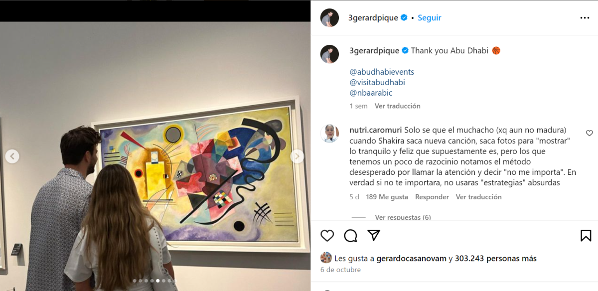 En la última publicación de Piqué, la pareja fue vista visitando el museo Louvre en Abu Dhabi, lo que también generó reacciones mixtas. “Que lleve a Clara Chía a un salón para que la peinen”, fue una de las críticas más sarcásticas en respuesta a la foto. La imagen capturó a la joven de espaldas, observando una obra del pintor ruso Vasili Kandinski, y el exfutbolista simplemente escribió: “Thank you Abu Dhabi” en la descripción.