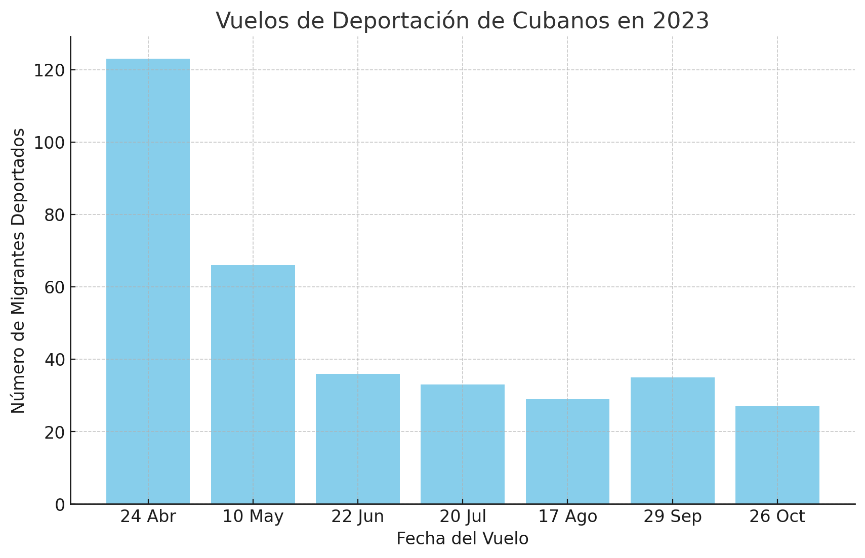 Los vuelos de deportación se reanudaron en abril pasado luego de una ronda de conversaciones migratorias entre las autoridades de Cuba y EEUU. Las devoluciones de migrantes se habían detenido en 2020 a raíz de la pandemia de coronavirus. Sin embargo, en los siete vuelos del 2023 destaca que los aviones no vuelan a plena capacidad. Lo anterior resulta curioso dado que según estimaciones en EEUU hay cerca de 40 mil cubanos con órdenes de deportación, algunas de ellas que datan desde hace más de tres décadas.