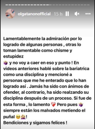 En este video, Olga resaltó que si le funcionó es porque ella también “ha tenido un régimen de ejercicios”. Con sus declaraciones, Olga solo quiso dejar claro que las operaciones no hacen magia y que es necesario acompañarlas de disciplina y buenos hábitos.