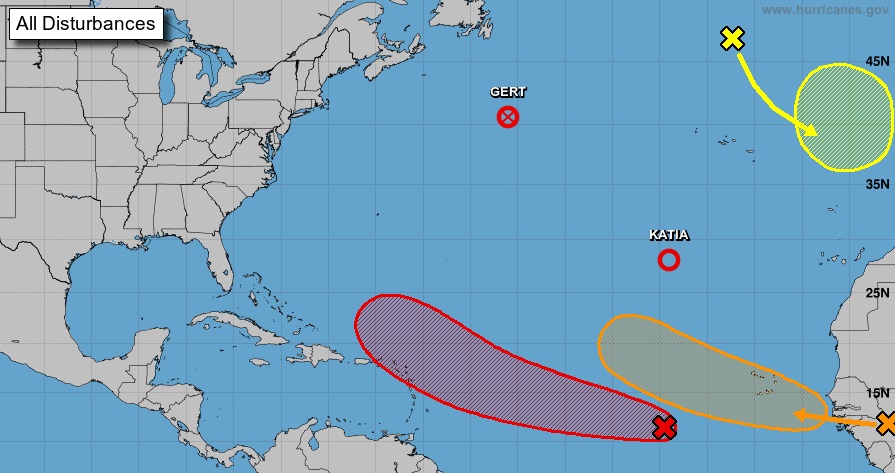 Mientras tanto, en el mismo océano se encuentran las tormentas tropicales Katia y Gert. La primera experimentó un rápido debilitamiento y se posiciona al noroeste de Cabo Verde, avanzando hacia el noroeste a 11 km/h con vientos máximos de 64 km/h, una disminución considerable desde los 96.5 km/h del sábado por la tarde.