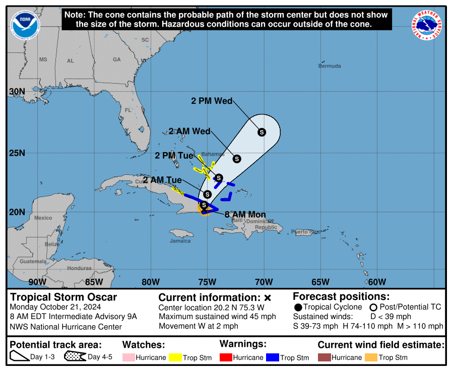 El meteoro continúa moviéndose lentamente sobre la región, causando inundaciones y fuertes marejadas, especialmente en la costa norte de Baracoa. Oscar ha seguido un recorrido hacia el oeste, pero muy lento, casi estacionario, avanzando a solo 4 km/h, lo que ha intensificado las precipitaciones en el área.