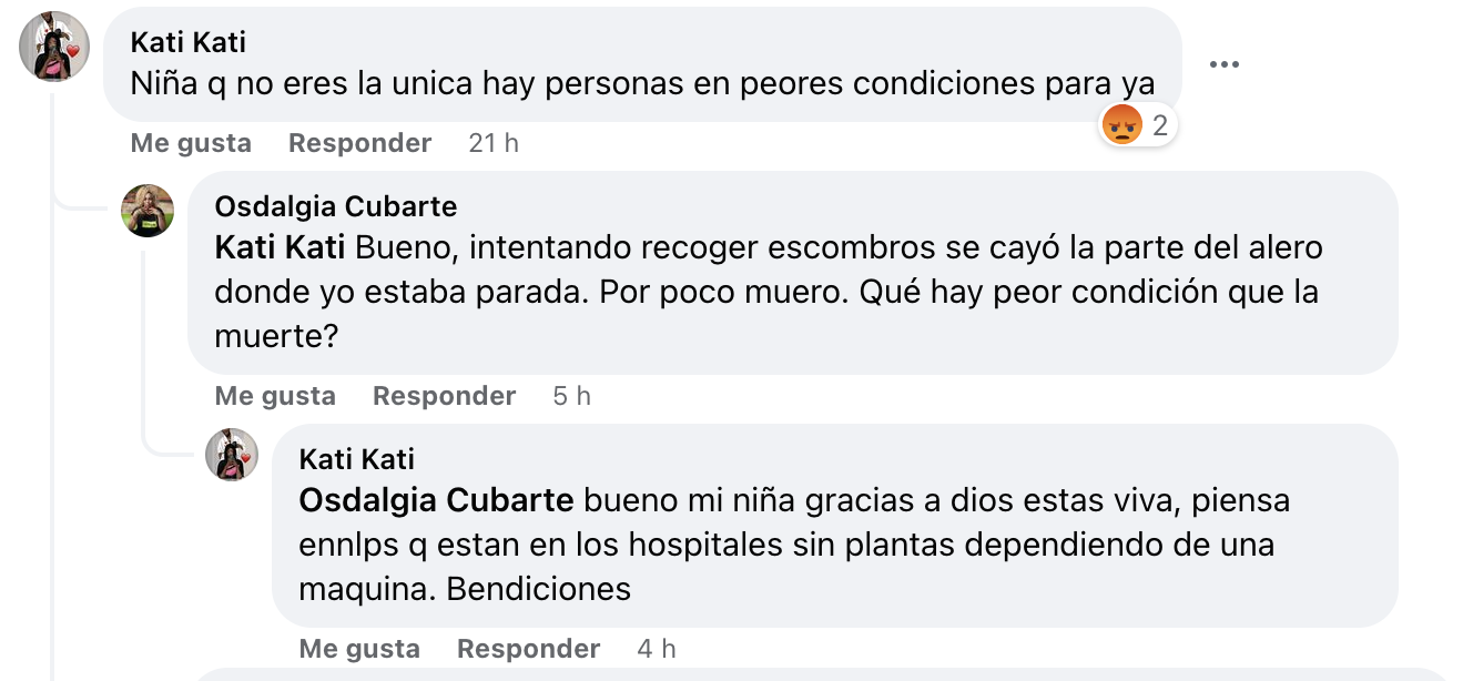 En el post, una usuaria nombrada Kati Kati le dijo a la cantante: “Niña que no eres la única hay personas en peores condiciones, para ya”. Ante este cuestionamiento, la antillana no se cayó y le respondió a la mujer que “intentando recoger escombros se cayó la parte del alero donde yo estaba parada. Por poco muero. ¿Qué hay peor condición que la muerte?”.