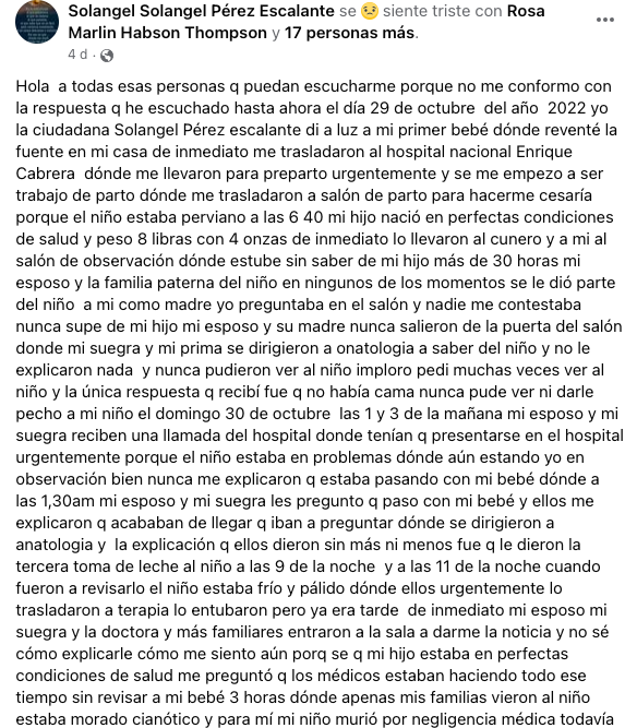 Asimismo, en otra publicación, la joven habanera dice que su “hijo nació en perfectas condiciones de salud y pesó 8 libras con 4 onzas, de inmediato lo llevaron al cunero y a mí al salón de observación dónde estuve sin saber de mi hijo más de 30 horas, mi esposo y la familia paterna del niño en ninguno de los momentos se les dio parte del niño ni a mí como madre, yo preguntaba en el salón y nadie me contestaba, nunca supe de mi hijo”.