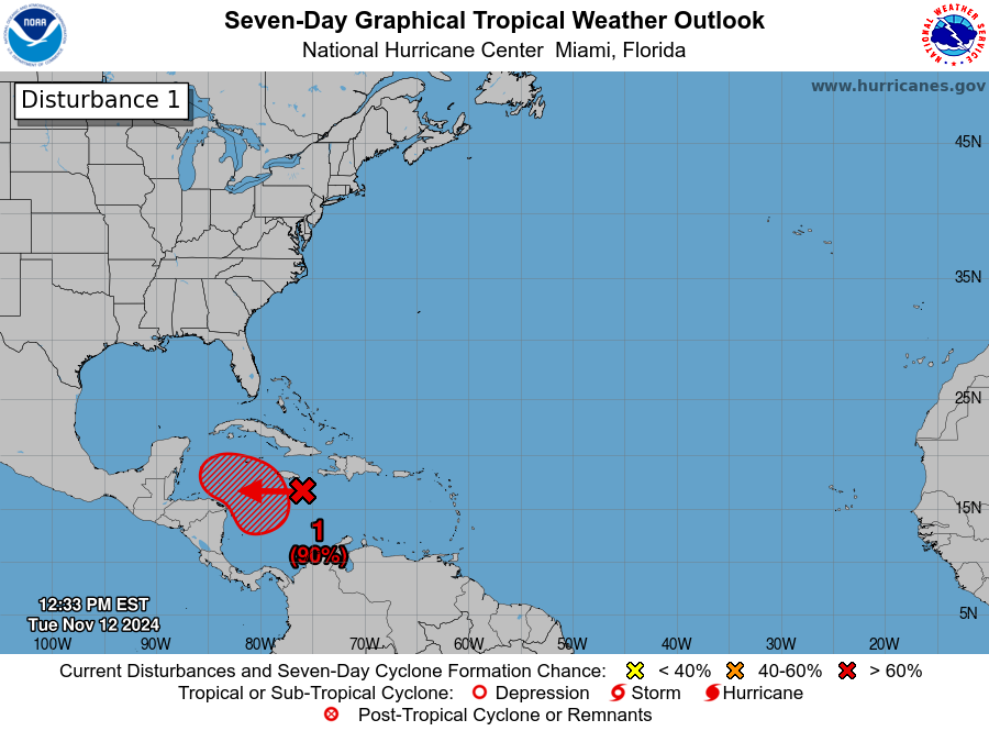 Este martes, el NHC informó que una extensa área de baja presión está generando lluvias y tormentas eléctricas desorganizadas sobre el Caribe central y occidental. Estas condiciones, según el centro, crean un ambiente propicio para que el sistema evolucione a tormenta tropical, y posiblemente a huracán. De acuerdo con el pronóstico, una depresión tropical podría formarse en dos a tres días mientras el sistema se desplaza lentamente hacia el oeste.