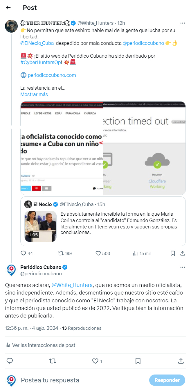 El perfil de Twitter @White_Hunters, conocido como Cyber Hunter, publicó acusaciones infundadas contra Periódico Cubano. En su tuit, afirmó que el periodista conocido como “El Necio” había sido despedido por mala conducta y que el sitio web de Periódico Cubano había sido derribado por su grupo de hackers, #CyberHuntersOp.