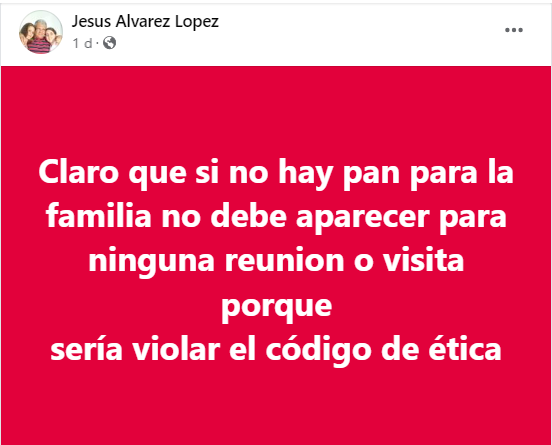 “Claro que si no hay pan para la familia no debe aparecer para ninguna reunión o visita porque sería violar el código de ética”, escribió en su perfil de Facebook el comunicador, con más de 40 años de carrera en medios oficialistas, dedicados al sector agroalimentario.