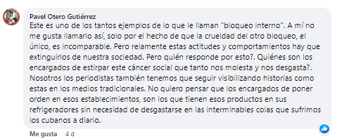 “No quiero pensar que los encargados de poner orden en esos establecimientos son los que tienen esos productos en sus refrigeradores sin necesidad de desgastarse en las interminables colas que sufrimos los cubanos a diario”, concluyó.