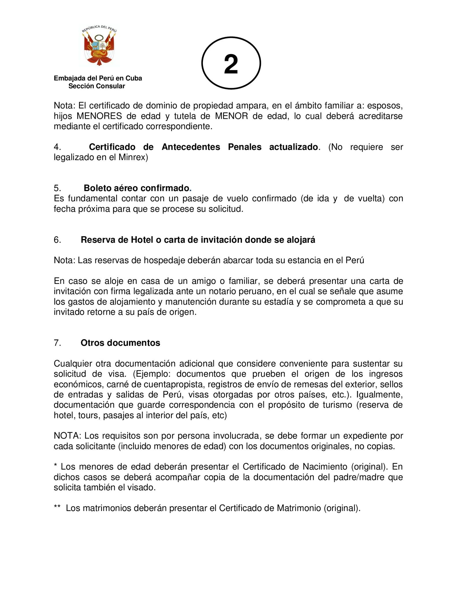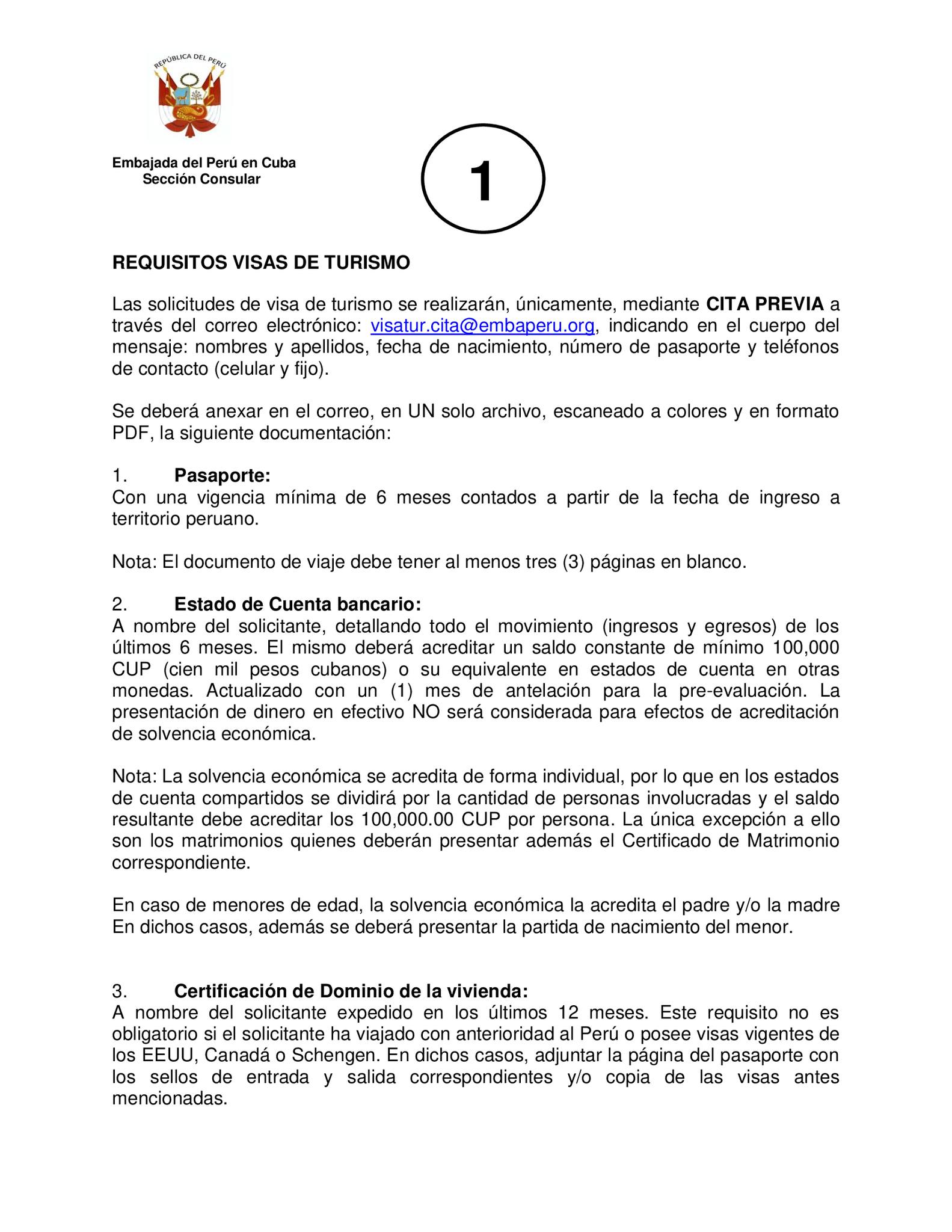Otro requisito exigido dentro de los documentos que conforman ese único PDF que funciona como expediente del viajero es la certificación de Dominio de la vivienda, expedido en los últimos 12 meses. Es decir, el solicitante de una visa de turismo a Perú debe ser propietario de una vivienda a su nombre. El Consulado del país andino en La Habana, aclara que este requisito no es obligatorio para aquellos que han viajado previamente a Perú o tienen visas vigentes a Estados Unidos, Canadá o Schengen.