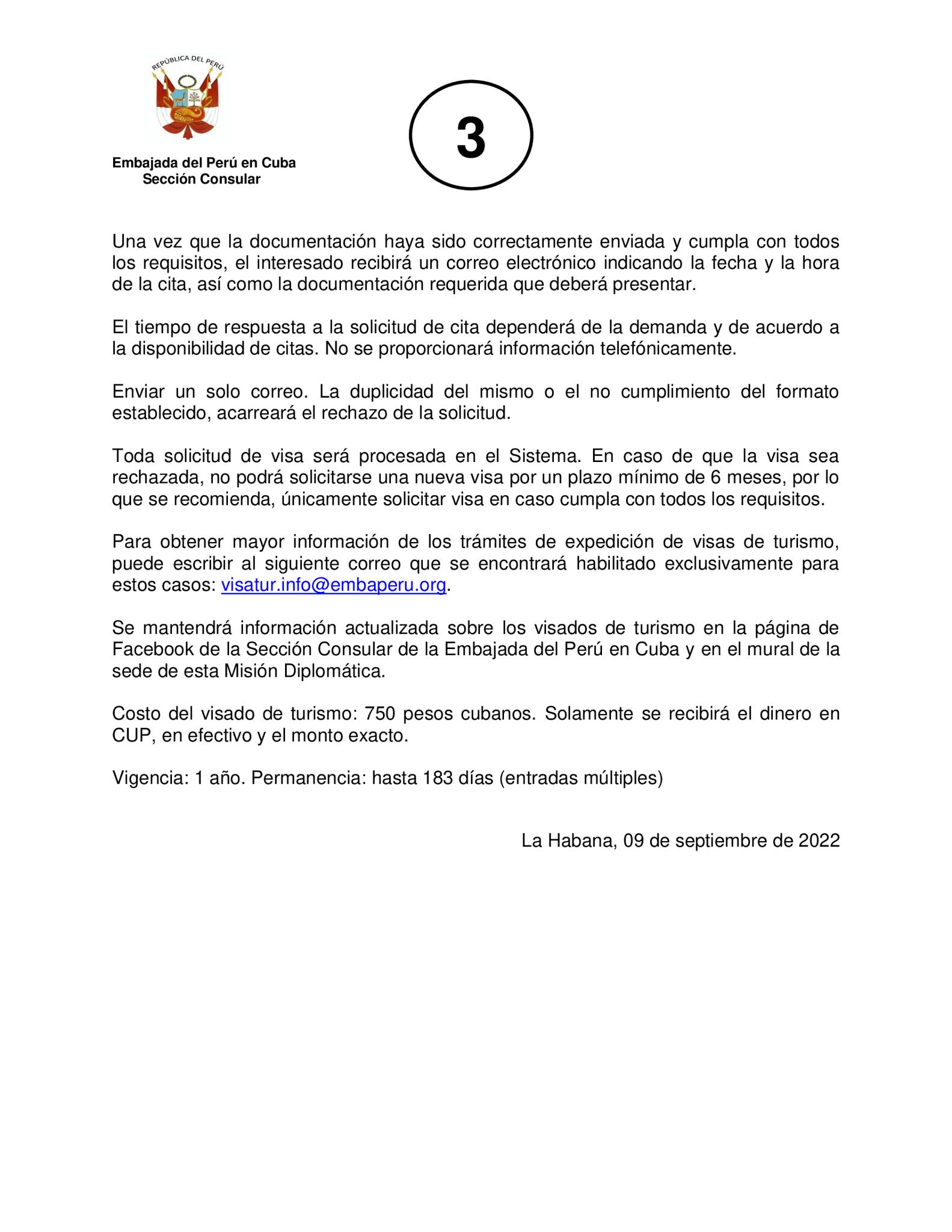 Con un email a visatur.cita@embaperu.org, los cubanos deben incorporar en el cuerpo del mensaje sus nombres y apellidos, fecha de nacimiento, número de pasaporte y teléfonos de contacto, tanto celular como fijo.