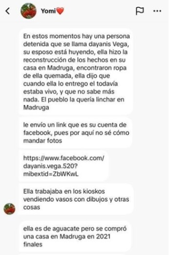 Estos datos fueron compartidos por una fuente identificada como Yomi, quien agregó que residentes de Madruga tenían las intenciones de agredir a Vega por su presunto involucramiento. Esta persona también reveló que la mujer trabaja en los quioscos vendiendo vasos con dibujos.