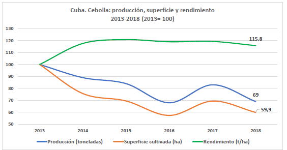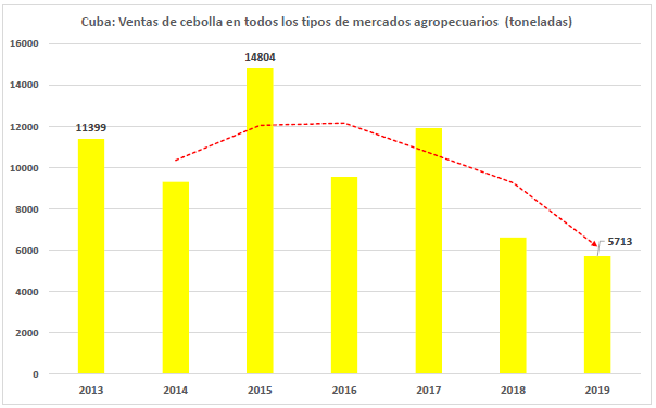 “La diferencia de las 37 mil toneladas dejadas de producir en 2018 en comparación con 2013, representan aproximadamente una reducción de 30%. O sea que desde 2013 a 2018 se “evaporó” casi un tercio de la producción de cebolla de Cuba”.