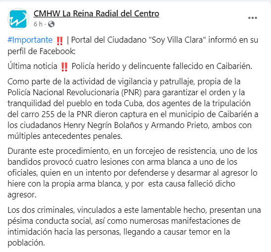 “Como parte de la actividad de vigilancia y patrullaje, propia de la PNR para garantizar el orden y la tranquilidad del pueblo en toda Cuba, dos agentes de la tripulación del carro 255 de la PNR dieron captura en el municipio de Caibarién a los ciudadanos Henry Negrín Bolaños y Armando Prieto, ambos con múltiples antecedentes penales”, explica la nota sin detallar cuál de los dos civiles resultó fallecido.
