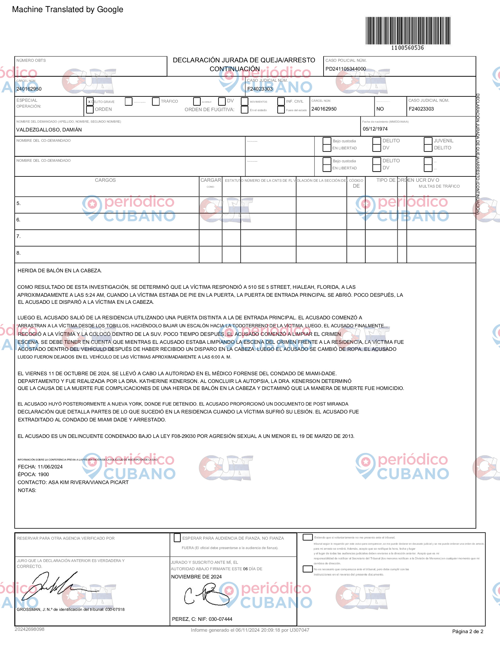 El jefe de la policía de Miami, Manuel A. Morales, confirmó la semana pasada que Valdez Galloso, de 49 años, es el único sospechoso en el caso. “Damián fue quien disparó, es el responsable y no hay ninguna otra persona involucrada”, afirmó Morales en una conferencia de prensa.
