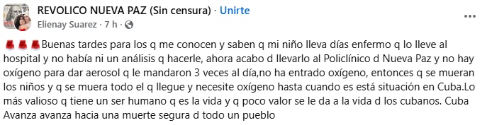 “Ahora acabo de llevarlo al Policlínico de Nueva Paz y no hay oxígeno para dar el aerosol que le mandaron tres veces al día. No ha entrado oxígeno. Entonces, ¿Se mueran los niños y todo el que llegue y necesite oxígeno?”, escribió Suárez en su publicación.