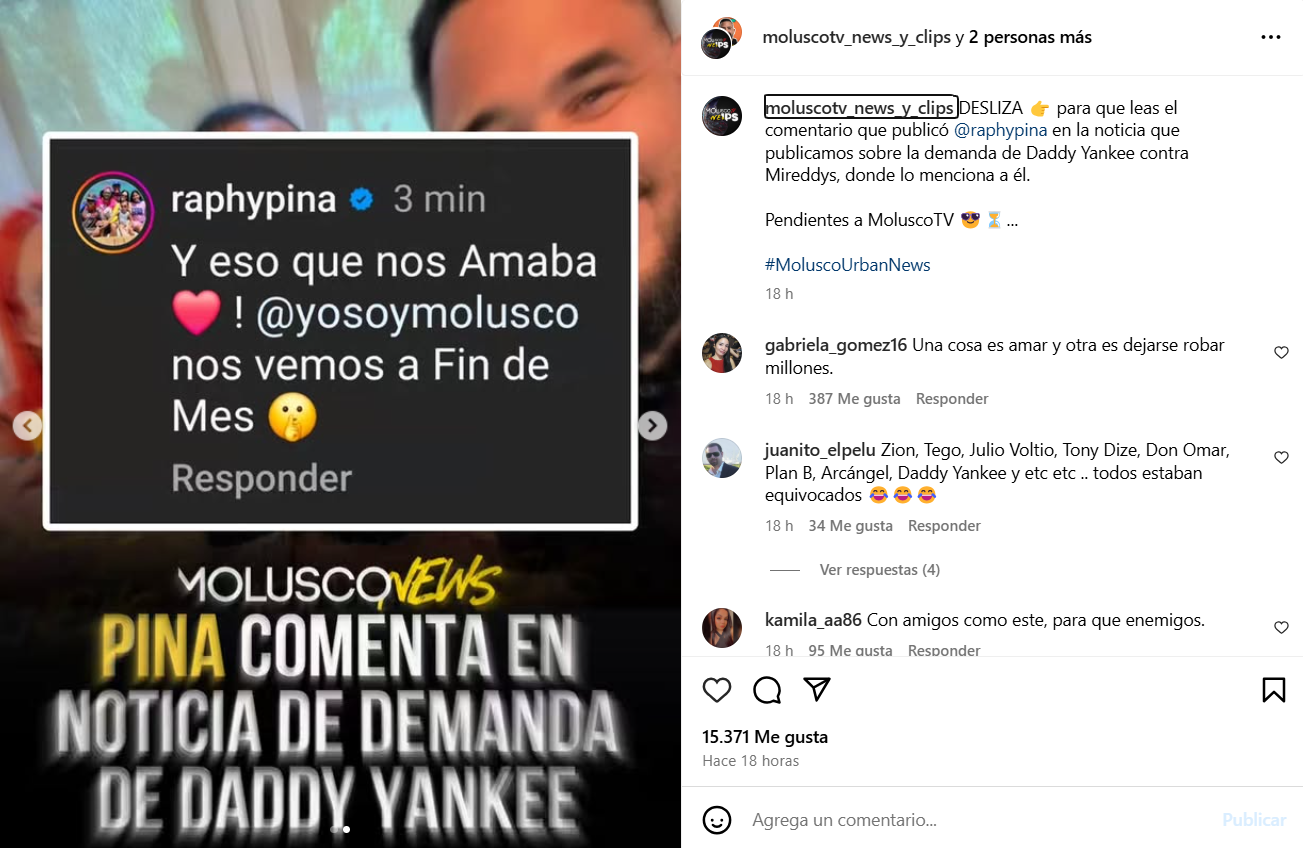 El productor también reaccionó en redes sociales a una publicación del locutor Molusco, quien compartió detalles de la demanda. En la sección de comentarios, Pina escribió: “Y eso que nos amaba. @yosoymolusco nos vemos a fin de mes”, lo que muchos interpretaron como una indirecta a Daddy Yankee.