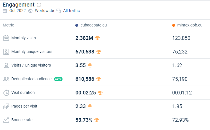De acuerdo con la empresa de análisis de sitios digitales Similar Web, el portal online del Minrex recibió en octubre pasado poco más de 123 mil visitas, una cifra que representa solo el 6% de las vistas que tuvo el sitio gubernamental de noticias Cubadebate en igual periodo de tiempo. Por lo tanto, si los hackers hubiesen tenido la intención de hacer una “guerra no convencional contra Cuba” la opción que más impacto tendría sería hackear a Cubadebate.