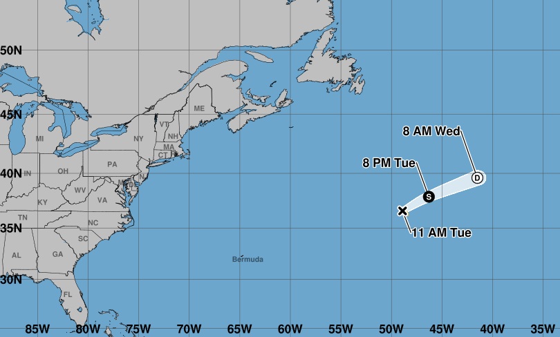 Este ciclón se encuentra actualmente a unos 1.930 kilómetros de las Azores y a aproximadamente 2.250 kilómetros al este de la costa este de los Estados Unidos, con vientos máximos sostenidos de 64 km/h.