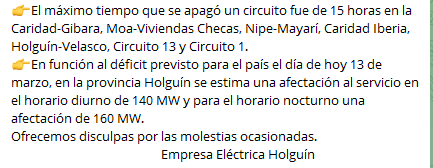 Por ejemplo, Villa Clara, que tiene 13 municipios, tendría que asumir una cifra teórica de 84.5 MW; sin embargo, le ordenan apagar 120 MW. Otro caso es la provincia de Holguín, cuya empresa eléctrica informa en su canal de Telegram que para este miércoles se afectarán 160 MW, cuando en una distribución equitativa debería tocarle solo 91 MW.