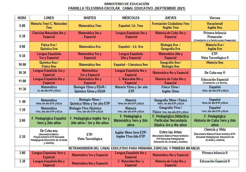 El Ministerio de Educación (Mined) de conjunto con las autoridades del Canal Educativo publicaron de forma oficial el calendario de teleclases que se estará emitiendo desde el venidero lunes 6 de septiembre con motivo del inicio del curso escolar en la modalidad virtual debido a la compleja situación epidemiológica que en la actualidad se vive en Cuba.