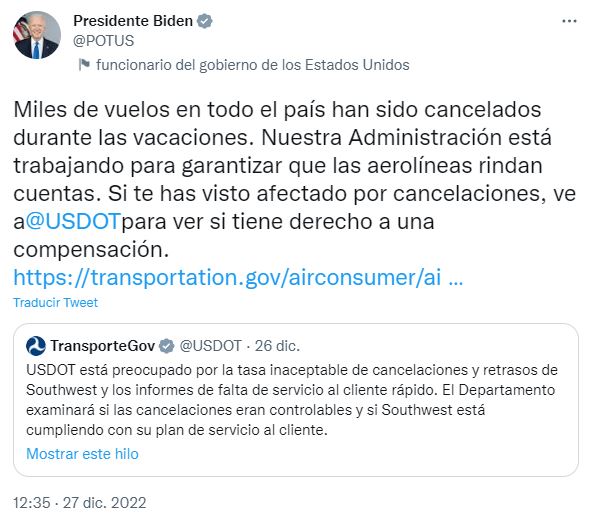 La cifra de cancelaciones llego a ser tan alta, que el presidente de los Estados Unidos, Joe Biden; comento el asunto en su cuenta oficial de Twitter.
