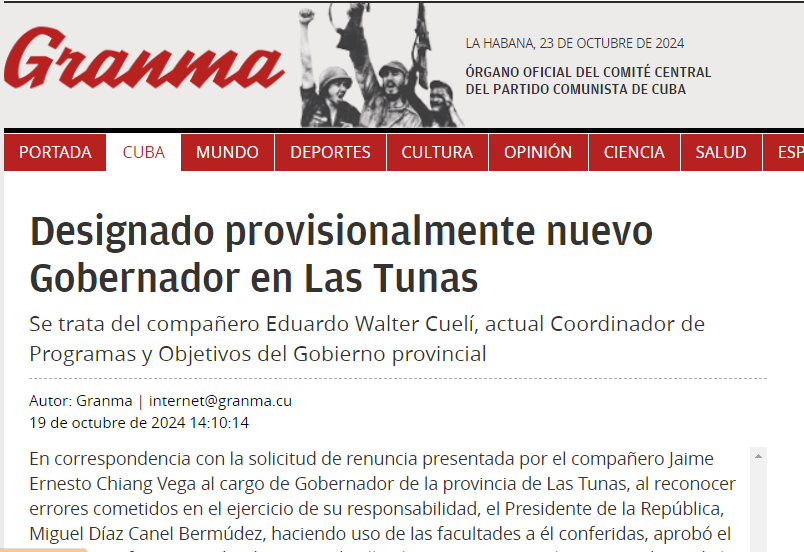 El gobernador de la provincia cubana de Las Tunas, Jaime Ernesto Chiang Vega, presentó su renuncia, la cual fue aceptada por el régimen de La Habana, mientras que el vicegobernador fue suspendido, según informó la prensa oficialista en una noticia que intentó pasar desapercibida en medio del colapso del sistema eléctrico y el paso del huracán Oscar.