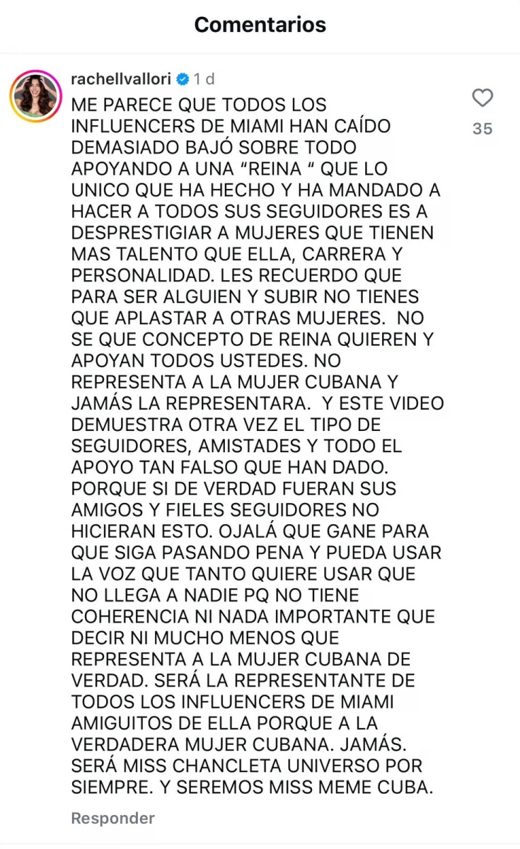 “Me parece que todos los influencers de Miami han caído demasiado bajo, sobre todo apoyando a una ‘Reina’ que lo único que ha hecho y ha mandado a hacer a todos sus seguidores es a desprestigiar mujeres que tienen más talento que ella, carrera y personalidad”, afirmó Vallori en la publicación del influencer Kenny Robert.