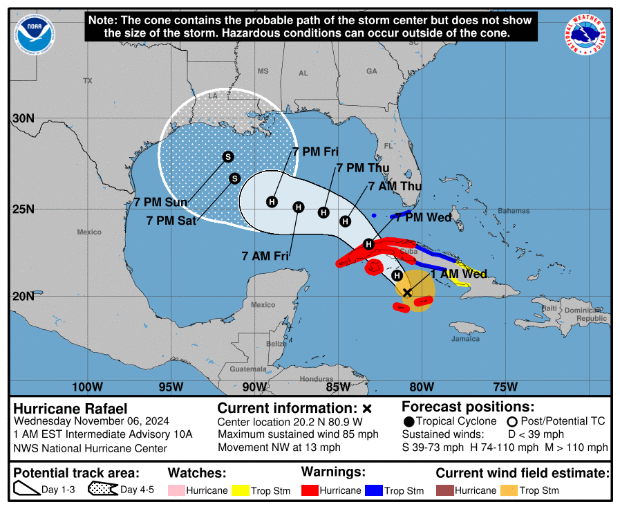 Tal y como se había pronosticado, la tormenta tropical Rafael se convirtió en huracán durante la tarde del martes 5 de noviembre, y ahora los pronósticos destacan que podría impactar a Cuba como categoría 2. El meteoro se continuará intensificando mientras se traslada por los mares al sur del país caribeño, muy próximo a Islas Caimán.