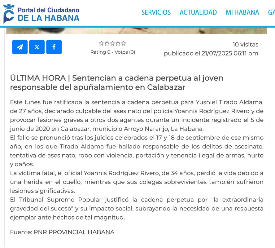 El Tribunal Supremo Popular de Cuba ratificó, este lunes 21 de julio de 2025, la sentencia de cadena perpetua impuesta a Yusniel Tirado Aldama, de 27 años, declarado culpable del asesinato de un oficial y de causar heridas graves a otros dos agentes.