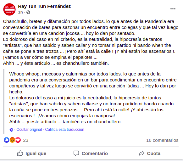 En otra publicación, el trovador ataca a los medios independientes cubanos que hicieron eco de la denuncia contra Bécquer. “Se ofrece sustanciosa recompensa por la captura de estos dos elementos… favor de informar a El Estornudo, o Periódico Cubano, en caso de tener noticias sobre ambos, no importa que sean falsas, las pagamos igual”, expresó Fernández junto a una foto de su colega.