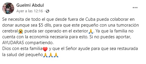 “Se necesita la cooperación de cualquier persona fuera de Cuba, aunque sea cinco dólares para que este pequeño con un tumor cerebral pueda ser operado en el exterior. La familia no cuenta con la economía necesaria para esto. Si no puedes aportar, ayudarás compartiendo. Dios con esta familia y que el Señor ayude para que sea restaurada la salud del pequeño”, manifestó Abdul.