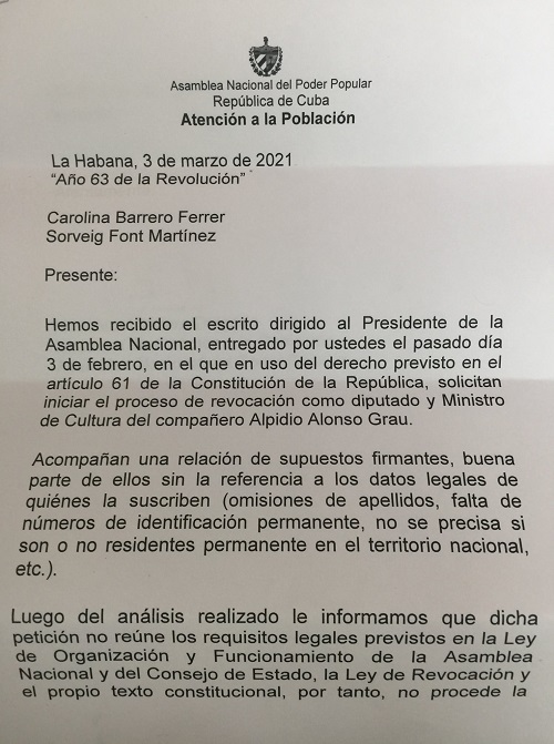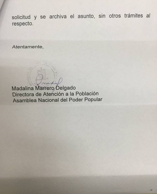 En la respuesta del parlamento cubano se señala que la petición no reúne los requisitos legales previstos en la Ley de Organización y Funcionamiento de la Asamblea Nacional y del Consejo de Estado.