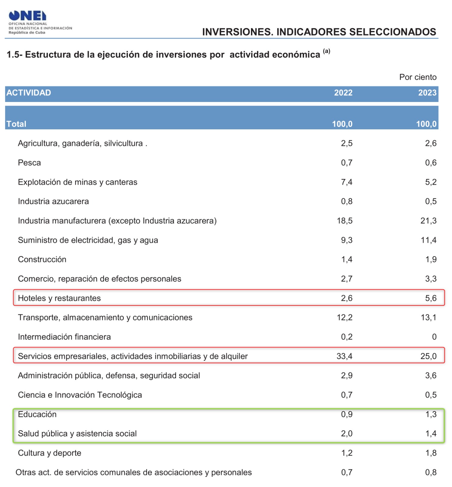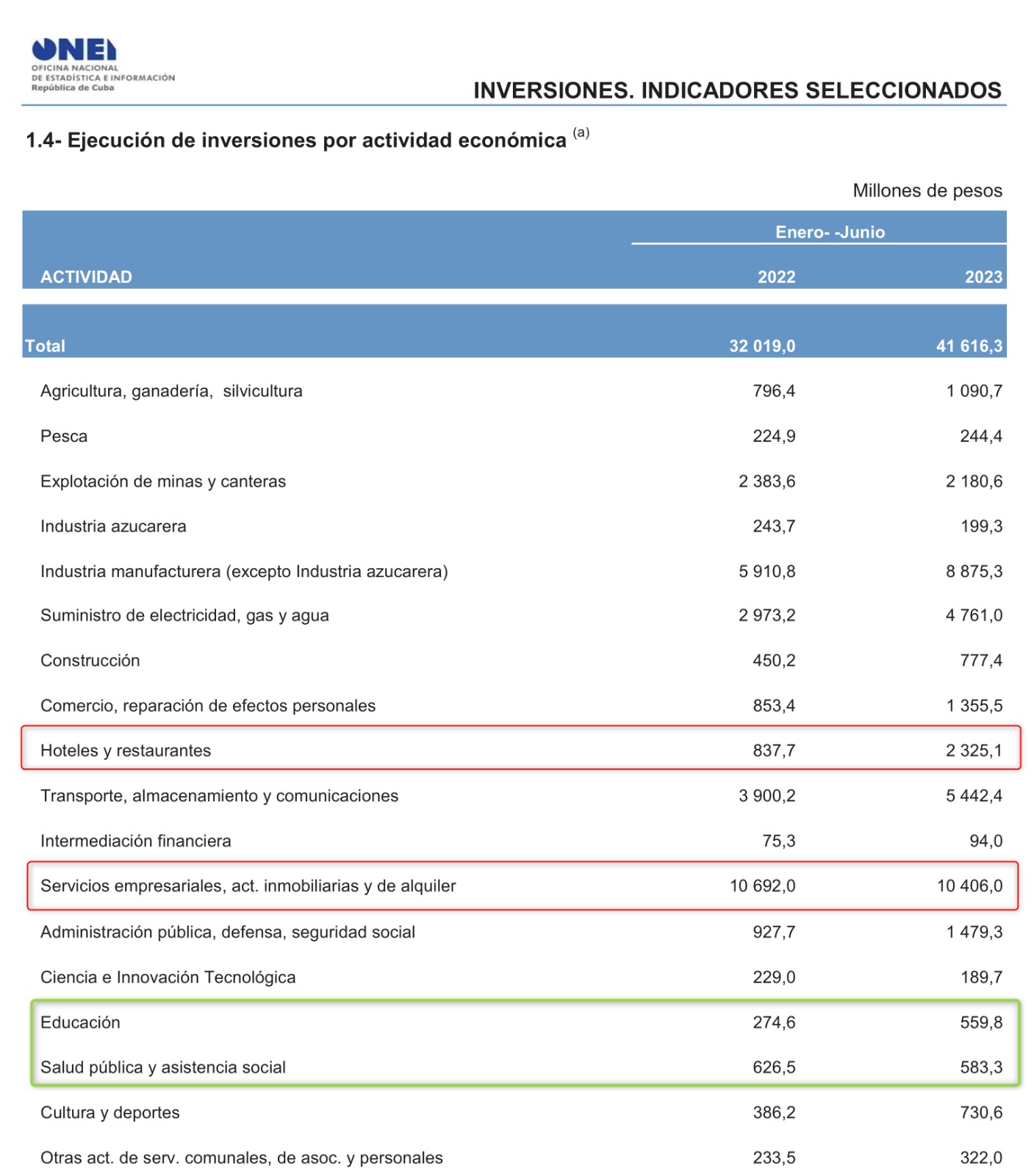 Al cierre del primer semestre de 2023, persisten las decisiones erradas del régimen castrista en cuanto a la asignación de dinero público a los distintos rubros. De acuerdo con datos de la Oficina Nacional de Estadísticas e Información (ONEI), los sectores de “servicios empresariales e inmobiliarios” y “hoteles y restaurantes” acumularon un 30.6% del total.