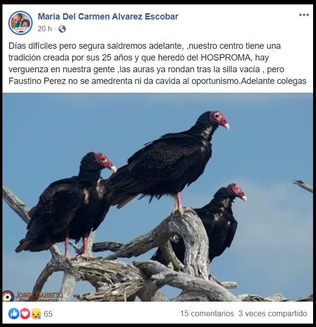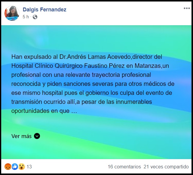 El rumor de la expulsión del doctor Lamas había circulado en el gremio por días. María del Carmen Álvarez, quien laboró en el Hospital Faustino Pérez y cuya hija, Arnella Torres Álvarez es parte del personal médico infectado, habló en una publicación sobre los días difíciles que le esperan al centro hospitalario.