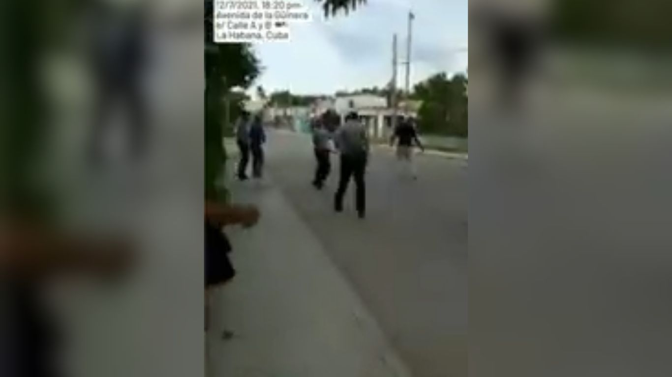 Posteriormente, las fuerzas represoras del régimen comienzan a arrojar piedras hacia las personas y se escuchan algunos disparos. El video muestra a Frómeta Compte rogando a los policías que no lancen rocas mientras grababa las protestas en La Güinera.