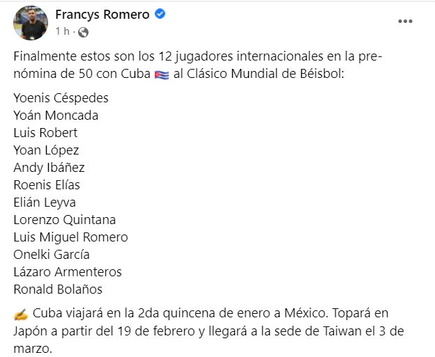 El Clásico Mundial está previsto para inicios de marzo de 2023 y Cuba estará participando en el grupo A que se desarrollará en Taiwán. Junto a los anfitriones, los cubanos se verán las caras con Italia, Holanda y Panamá.