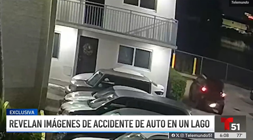 Las cámaras de vigilancia muestran el momento en que el auto se hunde en el agua. Vega logró escapar del vehículo a través de la ventana del conductor e instantes después fue rescatada por un oficial mediante el uso de una cuerda.