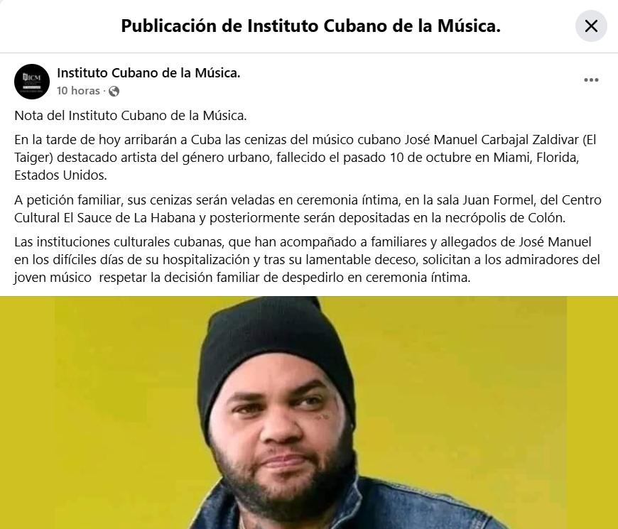El fallecimiento de El Taiger ha generado una controversia sobre la despedida pública del popular artista cubano. Mientras que su primo, Jorge Junior, anunció en redes sociales que se realizaría un funeral abierto en el Centro Cultural El Sauce, el Instituto Cubano de la Música desmintió la información.