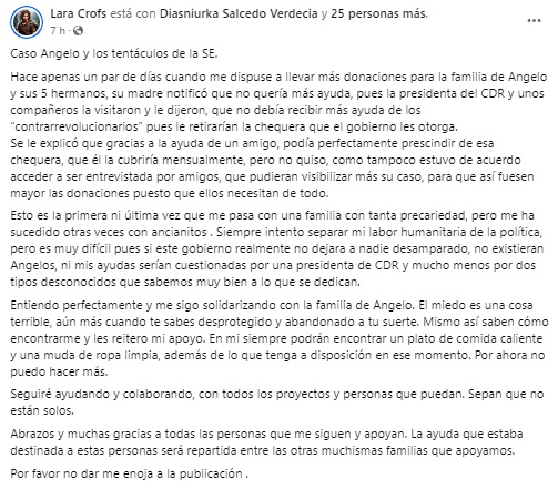 Según esta internauta, la madre le notificó que ya no deseaba más ayuda cuando intentó entregarle nuevas donaciones para Anyelo y sus hermanos. “La presidenta del Comité de Defensa de la Revolución (CDR) y otros compañeros la visitaron y le advirtieron que no debía aceptar ayuda de ‘contrarrevolucionarios’ si no quería perder la chequera que el gobierno les otorga”, relató Lafita tras saber por qué la mujer comenzó a rechazar el apoyo.