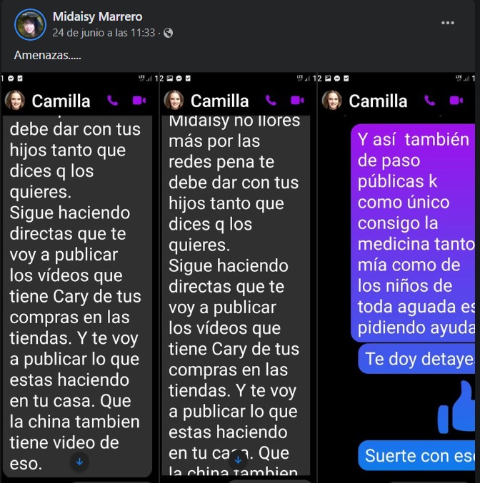 Marrero compartió en su muro algunos de los mensajes recibidos por una usuaria identificada como Camilla Vázquez. “Midaysi, no llores más por las redes. Pena te debe dar con tus hijos, tanto que dices que los quieres. Sigue haciendo directas que te voy a publicar los videos que tiene Cary de tus compras en las tiendas. Y te voy a publicar lo que estás haciendo en tu casa. Que la China también tiene video de eso”, le escribió la seguidora del régimen desde lo que podría ser un perfil falso.