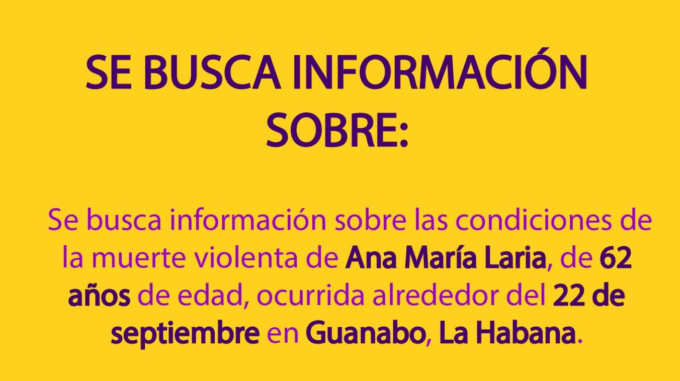 La muerte violenta de Ana María Laria, de 62 años, ha generado un llamado urgente por parte de la plataforma independiente YoSíTeCreo en Cuba (YSTCC), con el fin de saber de manera precisa las circunstancias que rodearon su fallecimiento en Guanabo, La Habana.