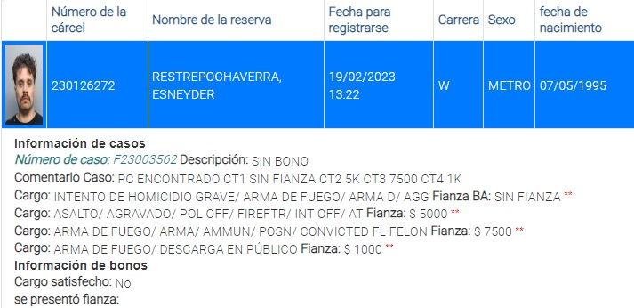 Restrepo Chaverra no recibió fianza por el cargo de intento de homicidio, un delito que en Florida se castiga dependiendo de si hubo una premeditación para tratar de realizar el asesinato o no hubo planificación.