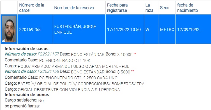 Fuste Durán compareció ante una corte de fianza a cargo de la jueza Mindy S. Glazer, quien le notificó los cargos de asalto agravado con un arma mortal y resistencia a un arresto.