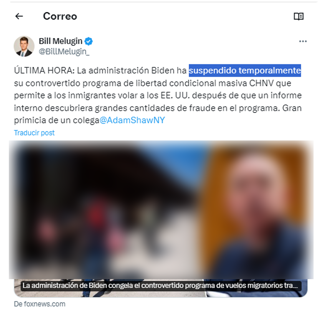 La administración de Joe Biden ha suspendido temporalmente el programa de parole humanitario, en vigor desde enero de 2023 y que otorgaba hasta 30 mil visas a migrantes de Cuba, Haití, Nicaragua y Venezuela, según informa la cadena Fox News y su corresponsal Bill Melugin.