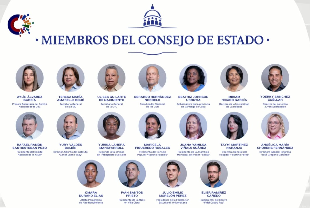 Estos son los 21 miembros del Consejo de Estado (2023-2028). (Captura de pantalla: Canal Caribe – YouTube)